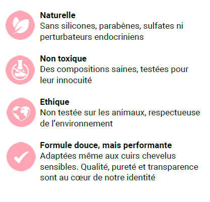 Notre gamme est formulée à partir d’ingrédients 100 % naturels, sans substances toxiques, pour prendre soin de vos cheveux en douceur, sans compromis sur la performance.